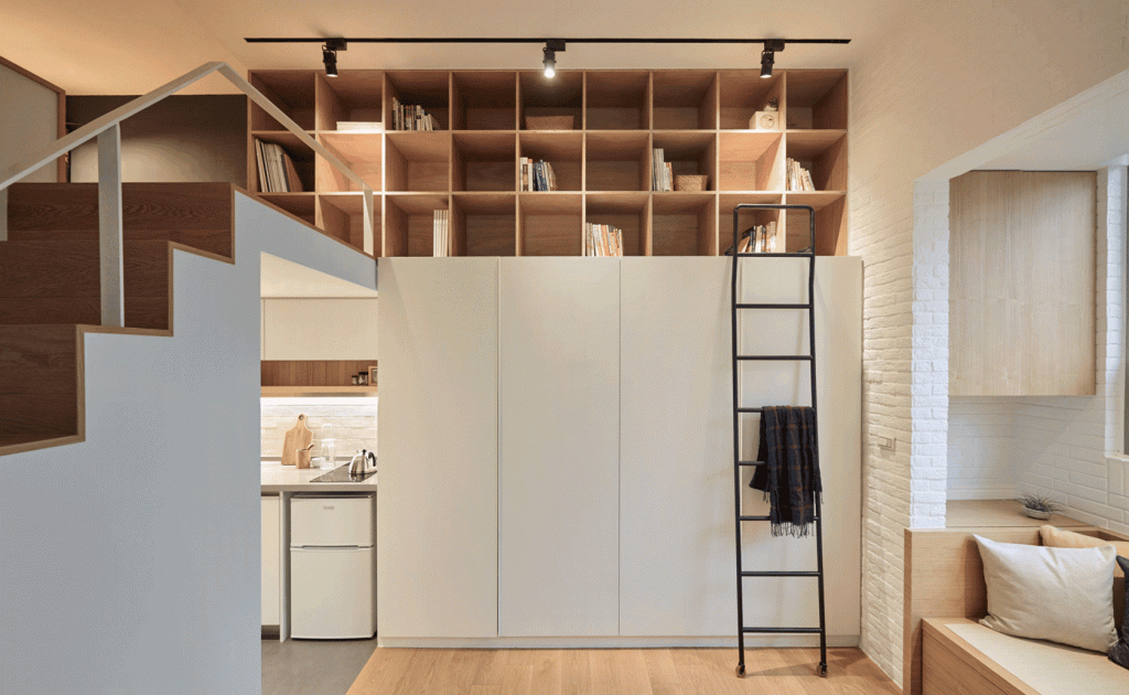 Example of flexible and creative storage in a small apartment.