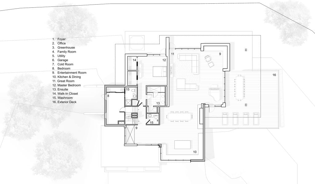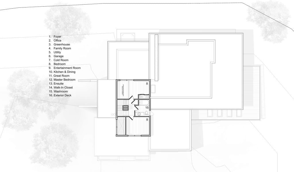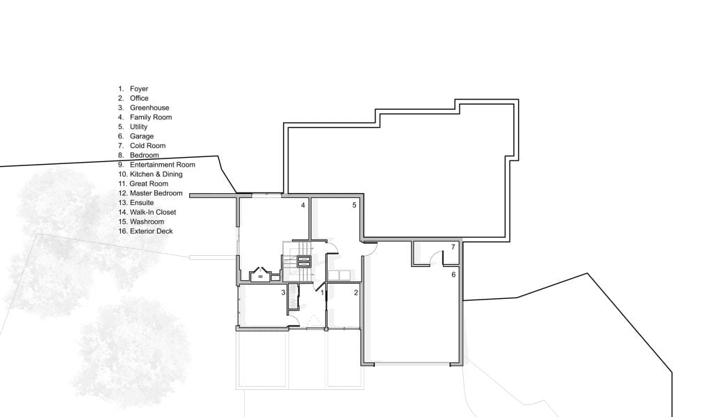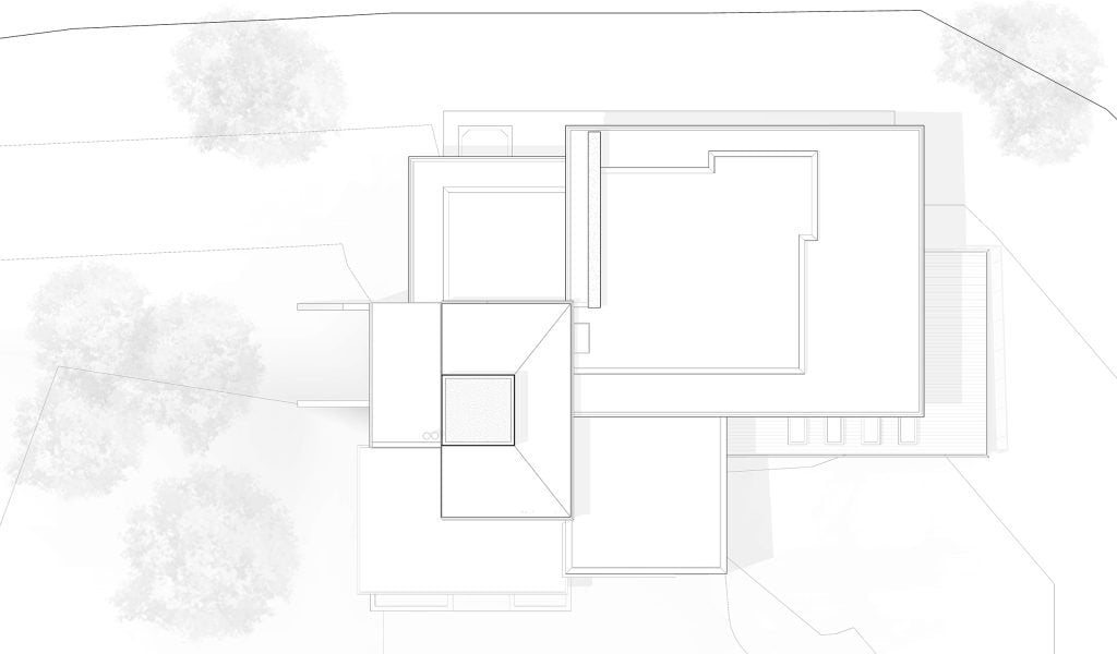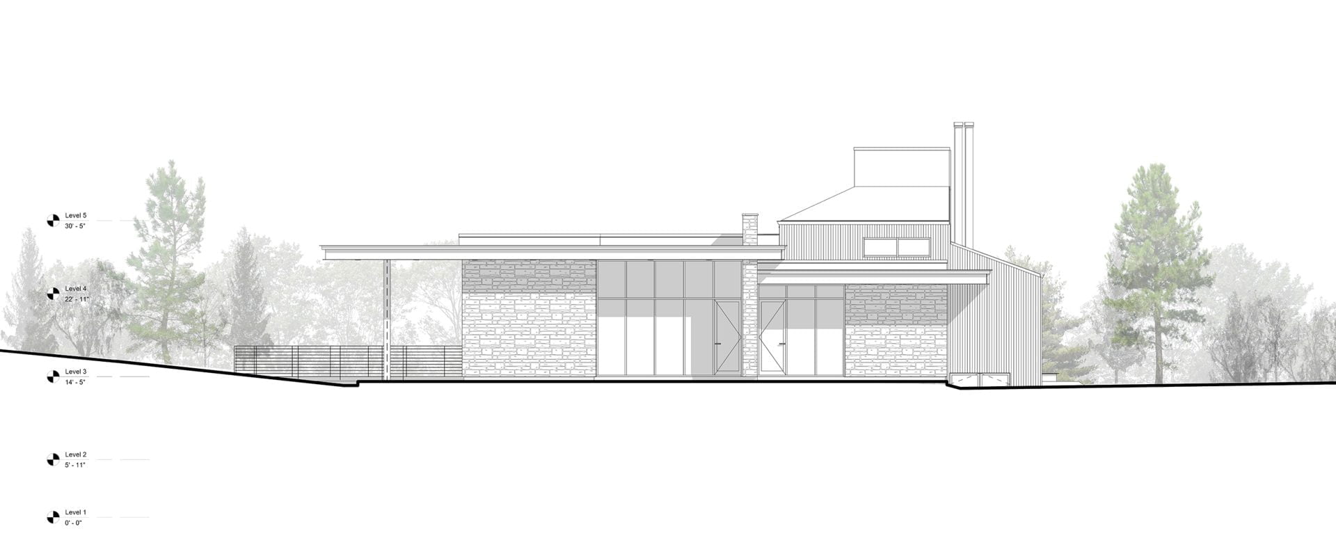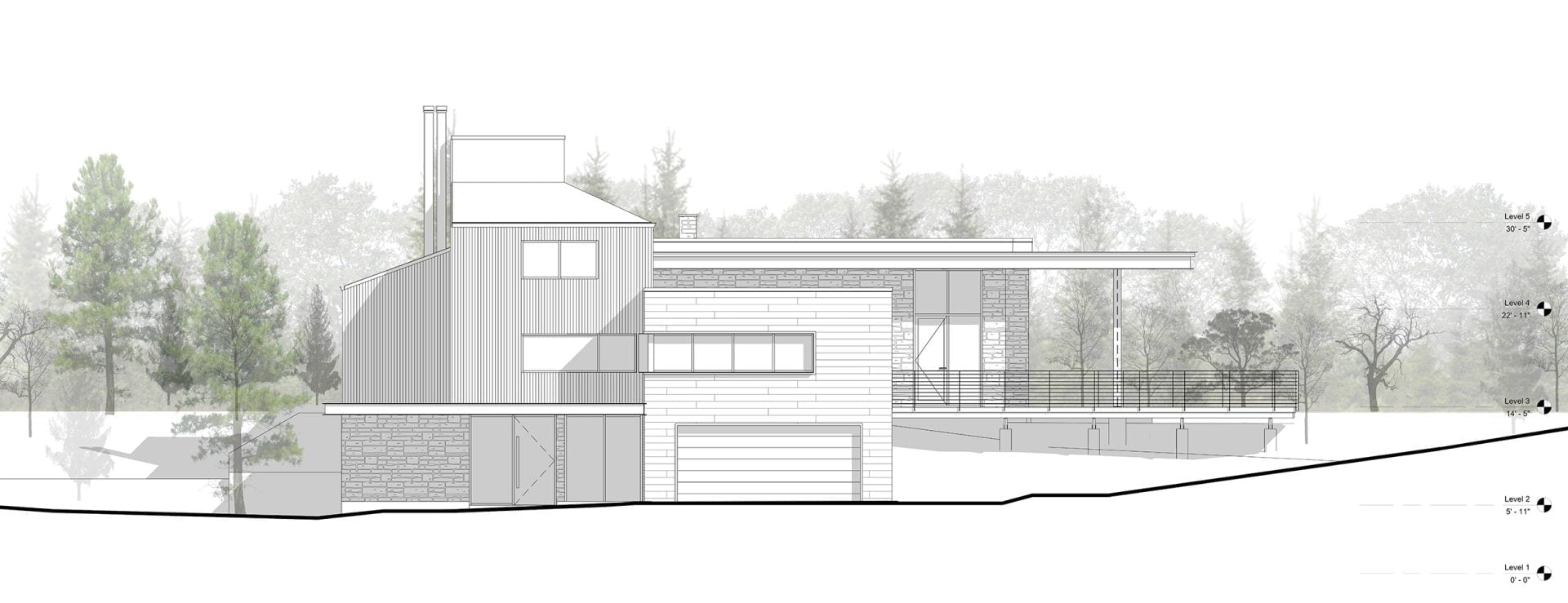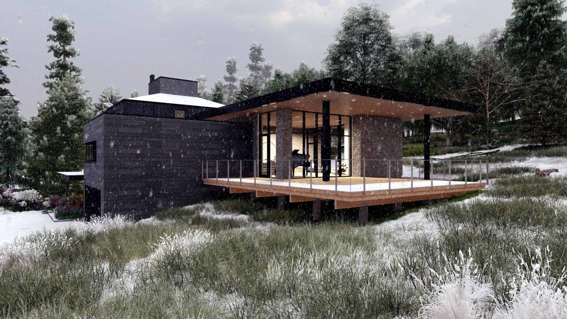 Through the utilization of 3 key materials (Stone, Wood & Metal) the facade becomes less monochromatic and the overall mass of the building is broken down into separate volumes. The base of the building is clad in stone panels to reinforce the connection to the ground. The new extension sits on top of the stone base as a very light structure made of glass and wood, focusing the views on the forest that surrounds the house.
